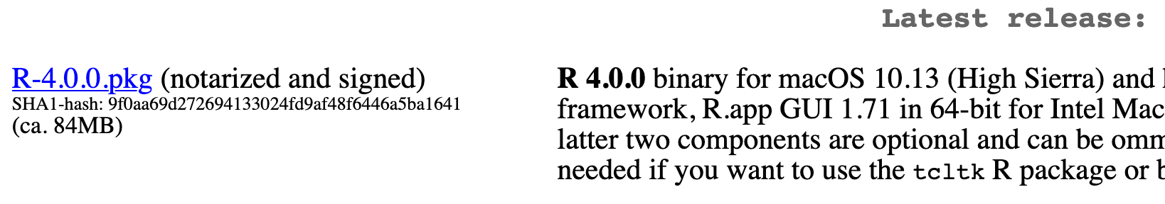 .pkgfile in the list of files (in this picture, it’sR-4.0.0.pkg; as of right now, the current version is also 4.0.0) and download it.::: {.cell} ::: {.cell-output-display}