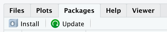 R packages are easy to install with RStudio. Select the packages panel, click on “Install,” type the name of the package you want to install, and press enter.