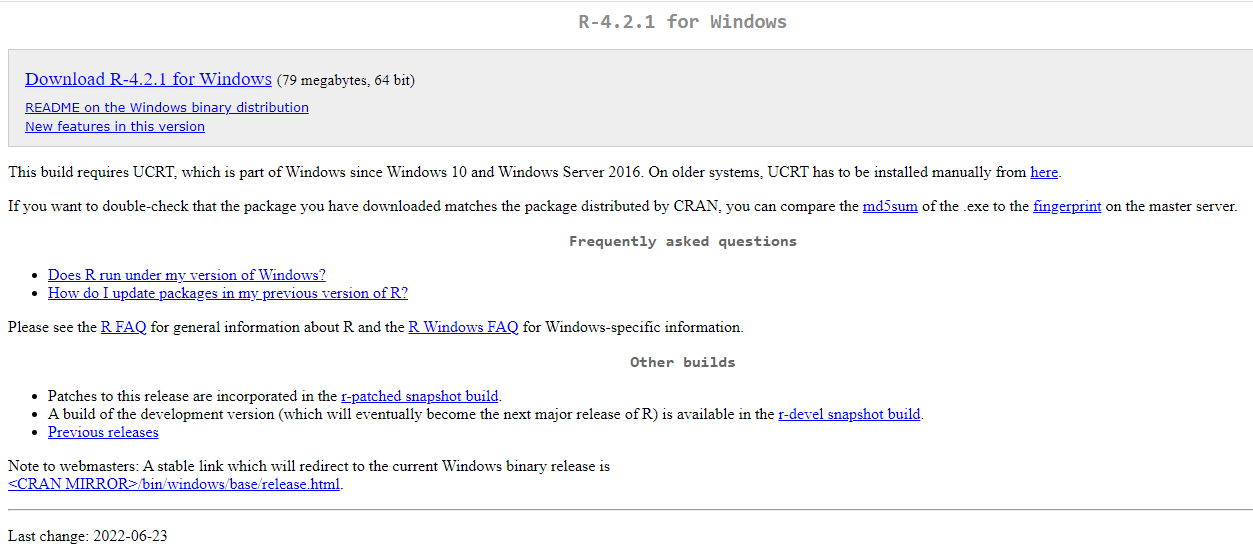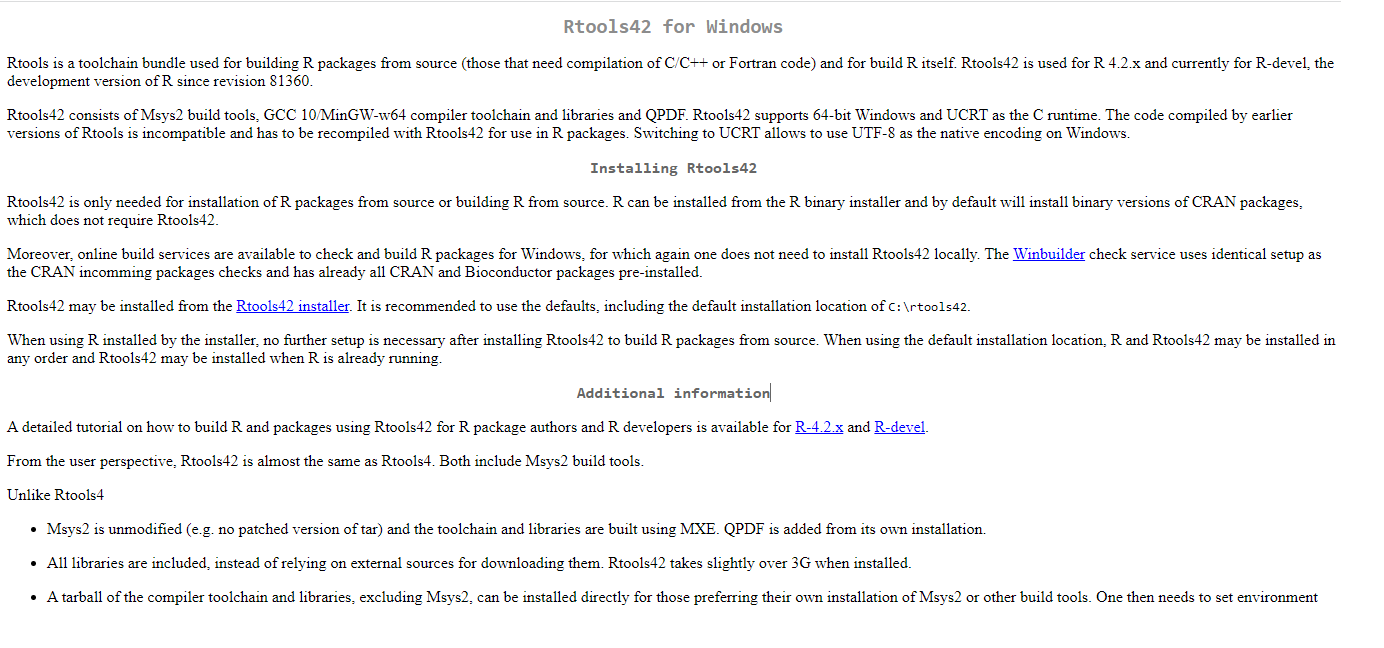 Por último, vamos a descargar Rtools 4.2 dando click en Rtools42 installer si y solo si tiene sistema operativo Windows. ¡Si tiene sistema operativo Mac o Linux (cualquier distro), no necesita instalar Rtools!
