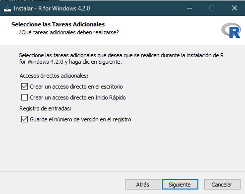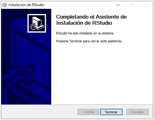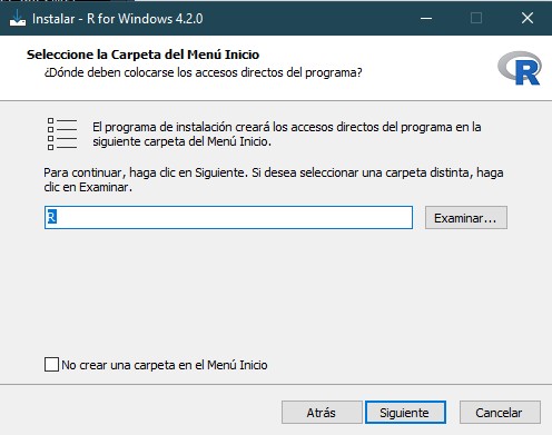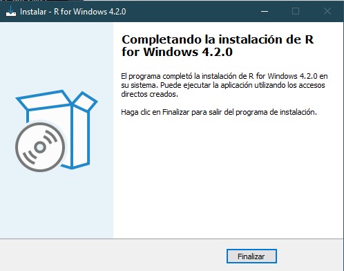 Como octavo paso, en las siguientes dos ventanas daremos click en “siguiente”, lo cual iniciará la instalación de R en nuestro dispositivo y, una vez termine, concluimos dando click en “finalizar”.