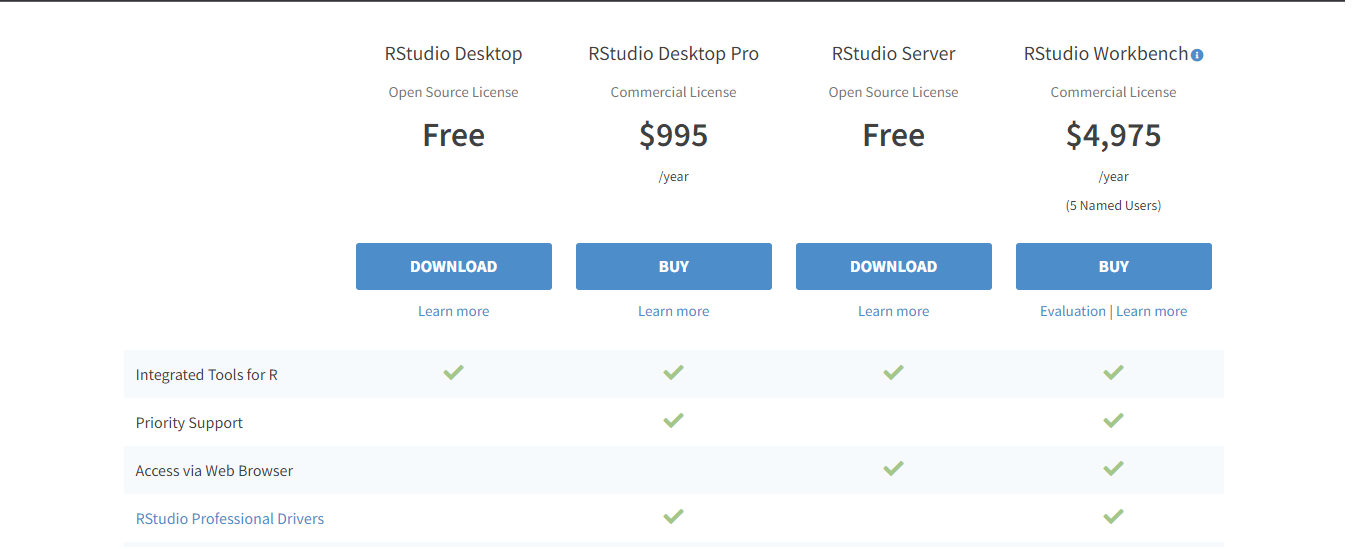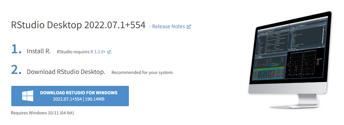 Al igual que en la sección anterior, para instalar la versión 2022.07.1+554. de nuestro IDE, primero vamos a la página oficial de Rstudio, escogemos la opción “Free” y damos click en “download RStudio for Windows”.