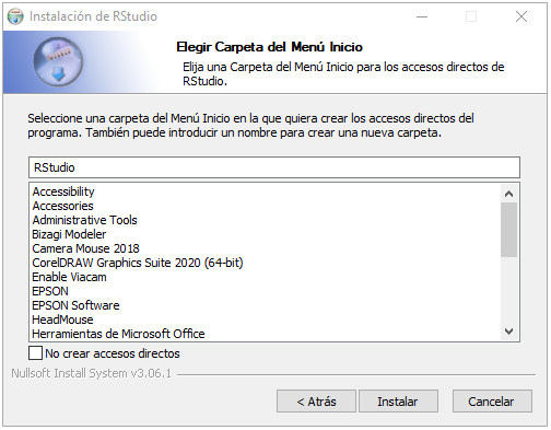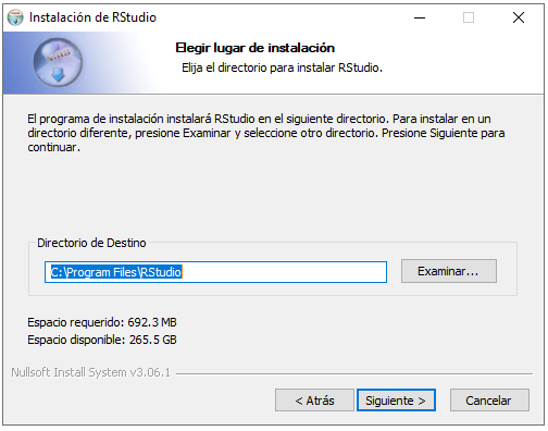 En la siguiente ventana nos preguntarán en qué carpeta deseamos instalar nuestro RStudio. Aquí es importante tener las mismas consideraciones que mencionamos en la primera sección: Si no tenemos acceso de administrador, es mejor escoger “Documentos”, de lo contrario, simplemente damos click en “siguiente” en esta ventana e “instalar” en la siguiente.