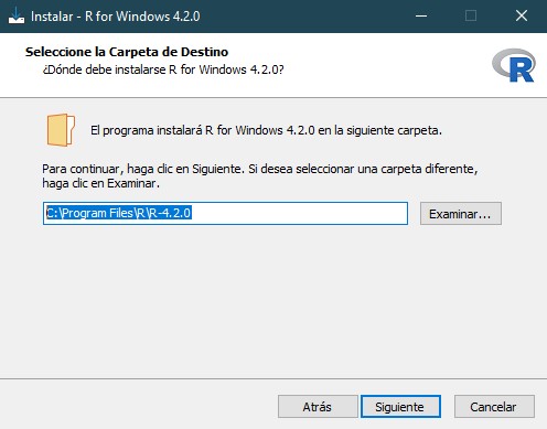 En la siguiente ventana, el tercer paso consiste en elegir en qué carpeta se instalará R y sus dependencias. Si tenemos permisos de administrador en nuestro dispositivo, podemos dejar que R se instale en la carpeta por defecto (“program files”); sin embargo, si esto no es así (por ejemplo si no es nuestro dispositivo o compartimos su uso mediante distintos usuarios), lo más recomendable es elegir otra ubicación, por ejemplo “documentos”. Esto nos evitará problemas de accesos o permisos durante nuestra práctica diaria con R.