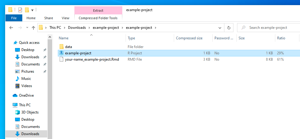 You should then finally have a real folder with all the contents of the zipped file. Open the R Project file and RStudio will point to the correct working directory and everything will work.