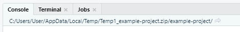 It is very tempting to try to open files from this view. However, if you do, things will break and you won’t be able to correctly work with any of the files in the zipped folder. If you open the R Project file, for instance, RStudio will point to a bizarre working directory buried deep in some temporary folder: