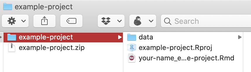 Double click on the downloaded .zip file. macOS will automatically create a new folder with the same name as the .zip file, and all the file’s contents will be inside. Double click on the RStudio Project file (.Rproj) to get started.