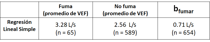 • El coeficiente de regresión estimado \(\hat{\beta}_1\) (\(b_\text{fumar}\)) es una medida de la asociación cruda (univariada/bivariada) entre la variable explicativa fumar y la variable respuesta volumen expiratorio forzado en 1º minuto (VEF).