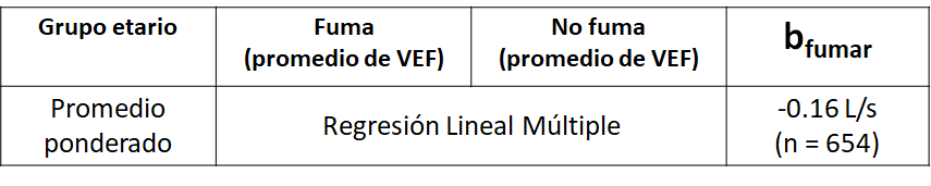 \[\hat{\text{VEF}}_i = \hat{\beta}_0 + \hat{\beta}_1\text{Fumar}_i + \hat{\beta}_kI(\text{Grupo etario} = k)\]