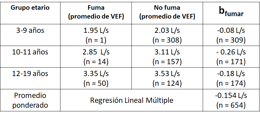 El VEF medio en fumadores fue 0.16 L/s menos que el VEF medio en no fumadores, manteniendo constante el grupo de edad.