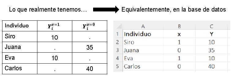 \[\text{Efecto Causal de }X \text{ (1 vs 0) en individuo }i = \] \[ = Y_i^{x = 1} - Y_i^{x = 0}\]