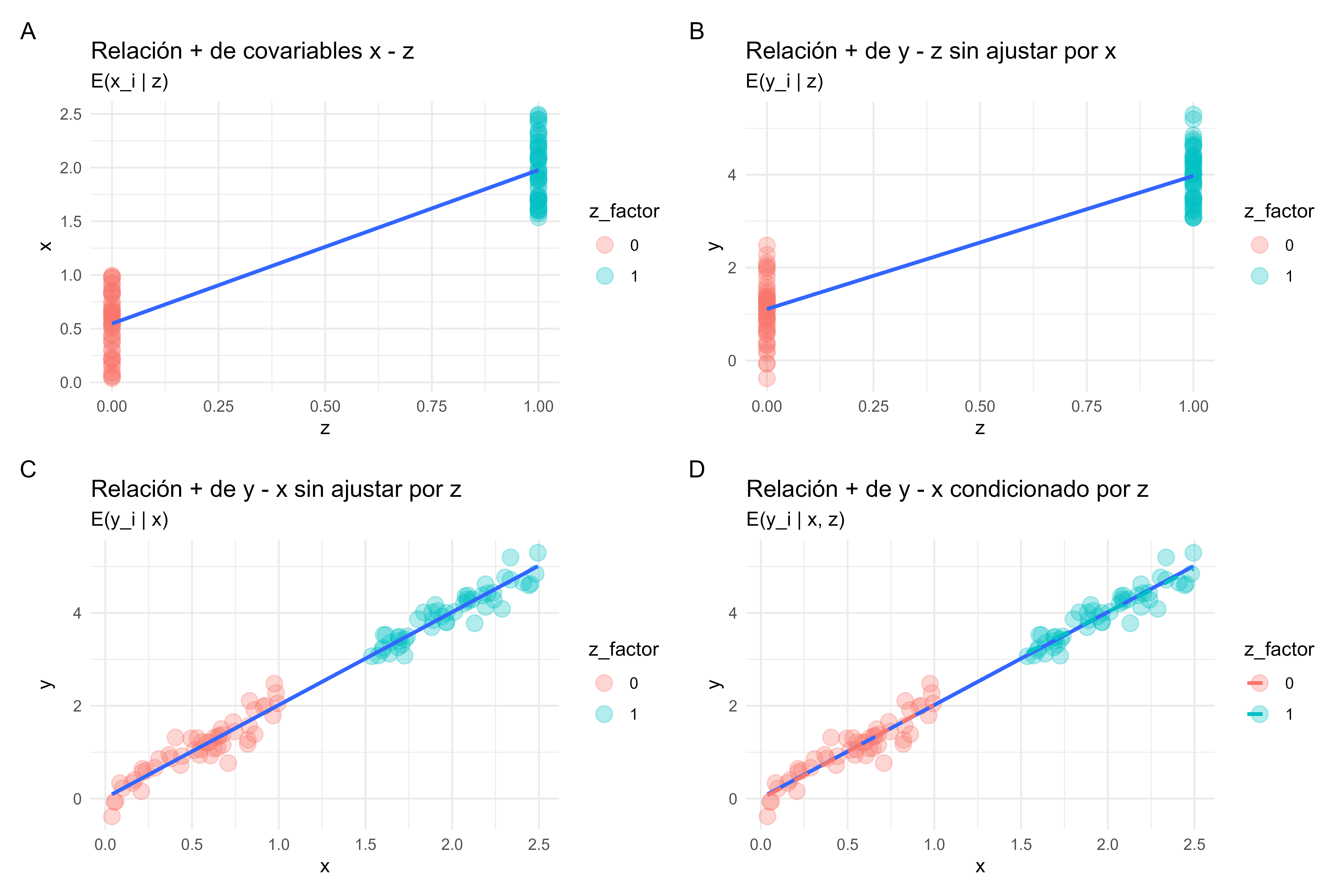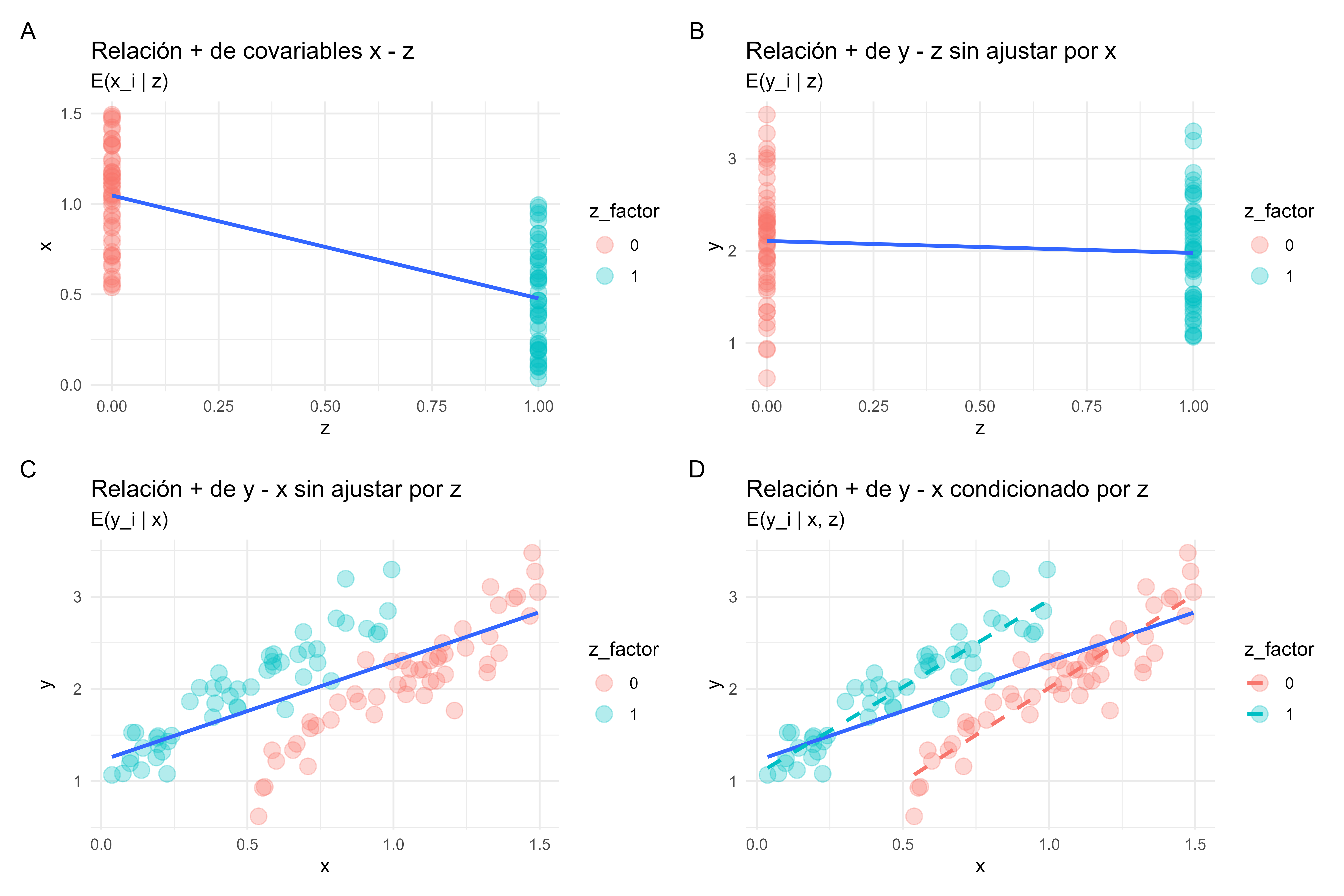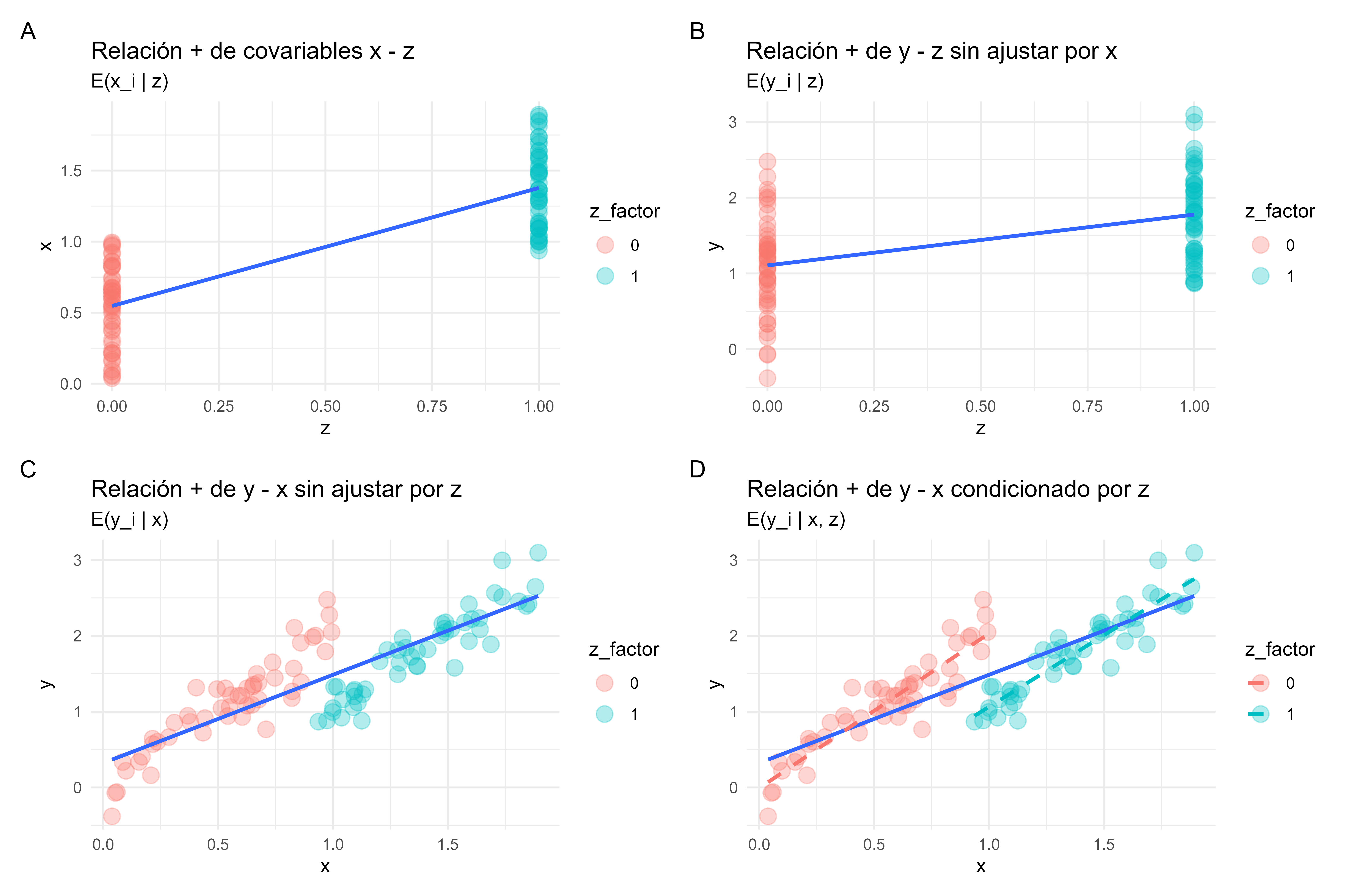 • Se usa una ecuación lineal para relacionar el desenlace \(y_i\) con la variable de intervención, condicionado por las otras variables.