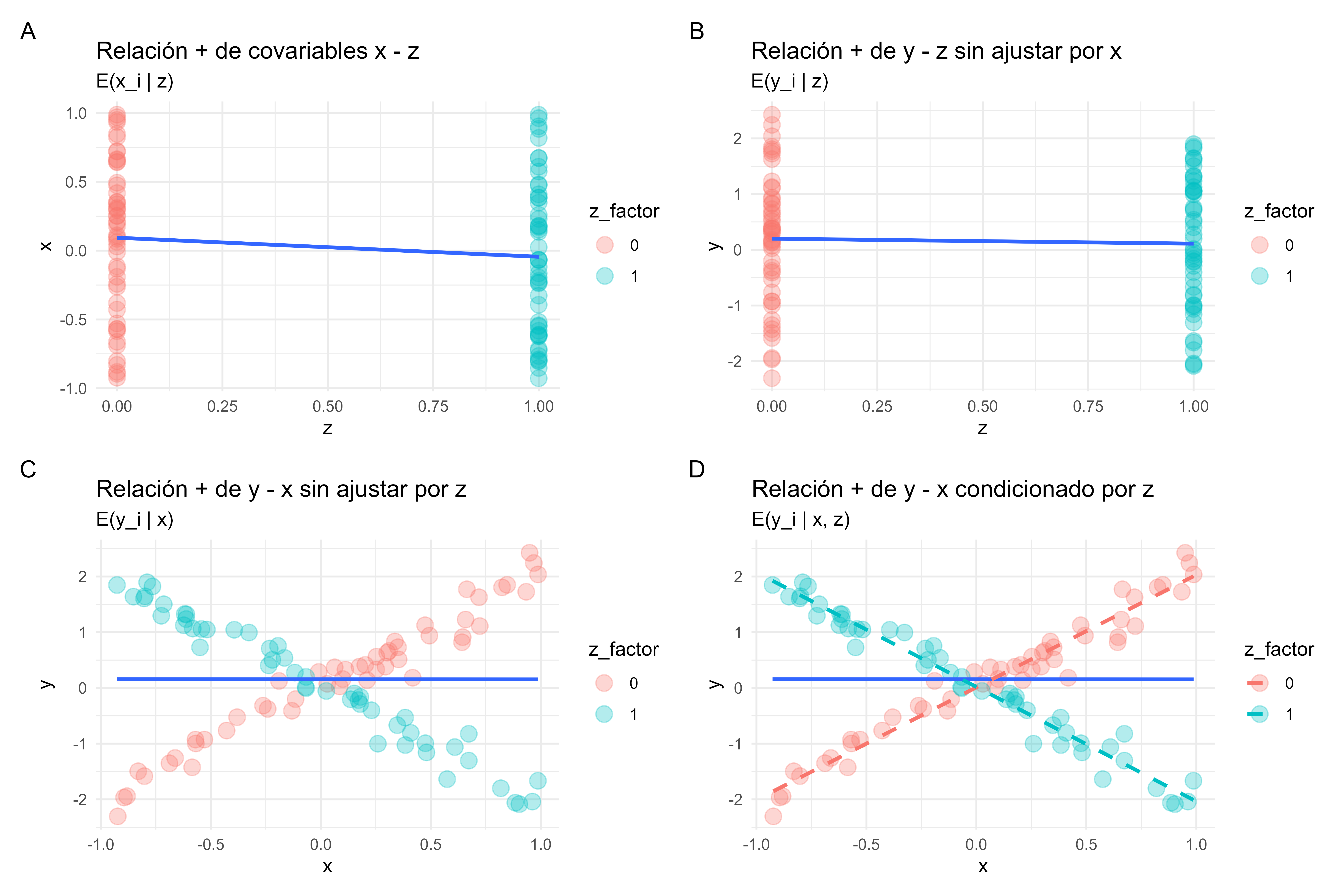 • La magnitud de la relación entre X e Y es la misma en cada estrato de Z. Efecto ajustado es mayor que efecto no ajustado (pendiente más pronunciada).